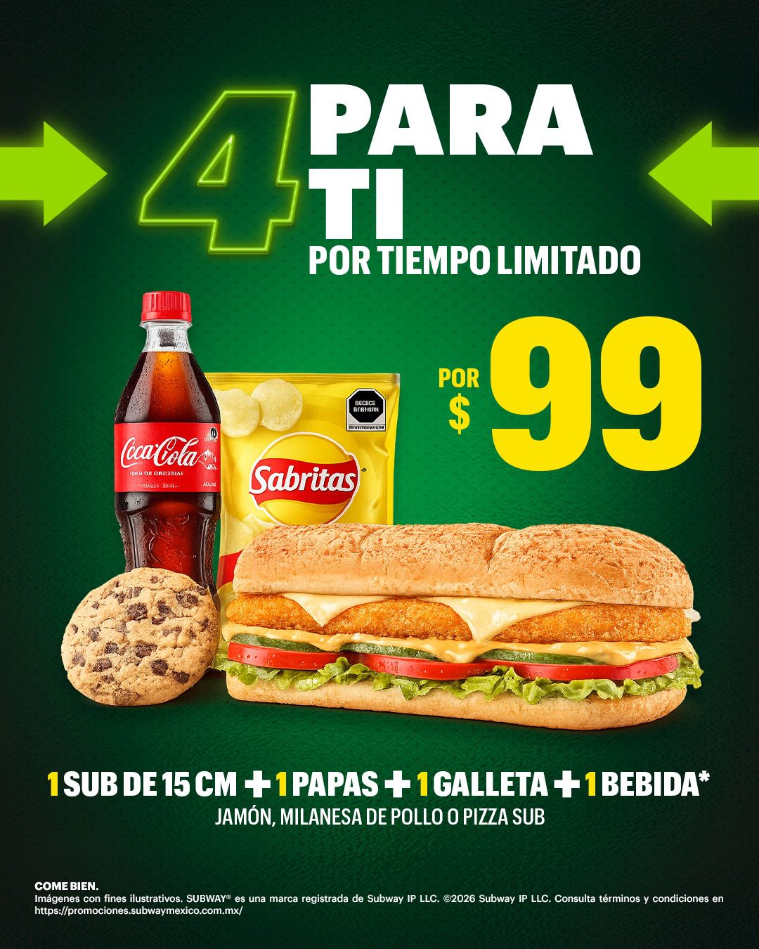 Si estás buscando opciones para comer, te comento que en Subway está su promoción ¡Más Sabor a Precio Irresistible!, en la que te ofrecen su Combo 4 para Ti por solo $99.00, incluye 1 Sub de 15 cm., + 1 Papas + 1 Galleta + 1 Bebida (no aplica en Fuze Tea, Lipton y Del Valle Fruta); la promoción estará vigente del 11 marzo al 12 de mayo de 2026 y es válida en sus sucursales físicas participantes.