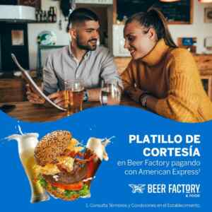 American Express en coordinación con Beer Factory establecieron una promoción en la que los días LUNES te darán un platillo participante GRATIS, en la compra de una cerveza de 500 ml o su equivalente en Beer Factory y pagas con Tarjetas American Express; la promoción estará vigente del 23 de enero al 31 de diciembre de 2020. Tu tarjeta debe estar vigente y al corriente en sus pagos.