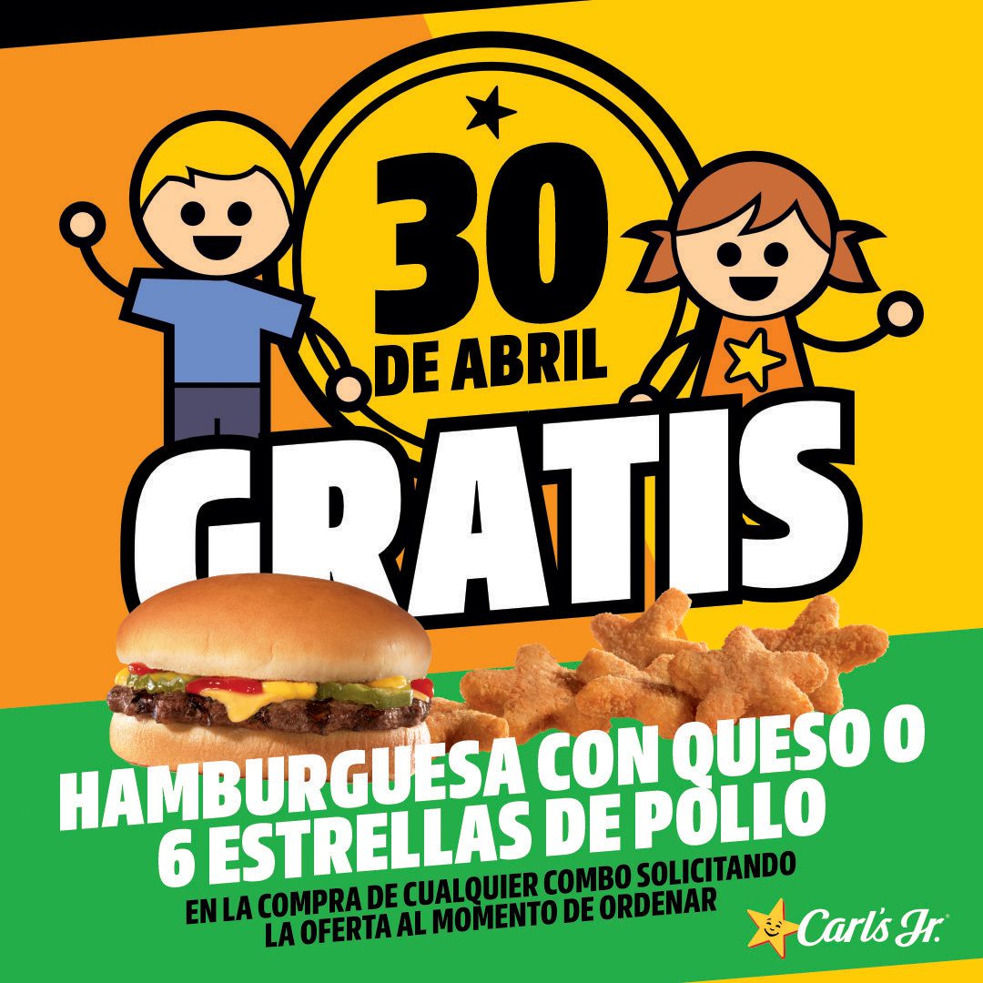 Para que celebres el Día del Niño 2025, en Carl’s Jr. tendrán una promoción especial, en la que, si realizas la compra de cualquier combo, te darán GRATIS 1 Hamburguesa con Queso o 6 Estrellas de Pollo; la promoción es válida en sucursales participantes (excepto restaurantes dentro de Aeropuertos) y solo estará vigente hoy miércoles 30 de abril de 2025.