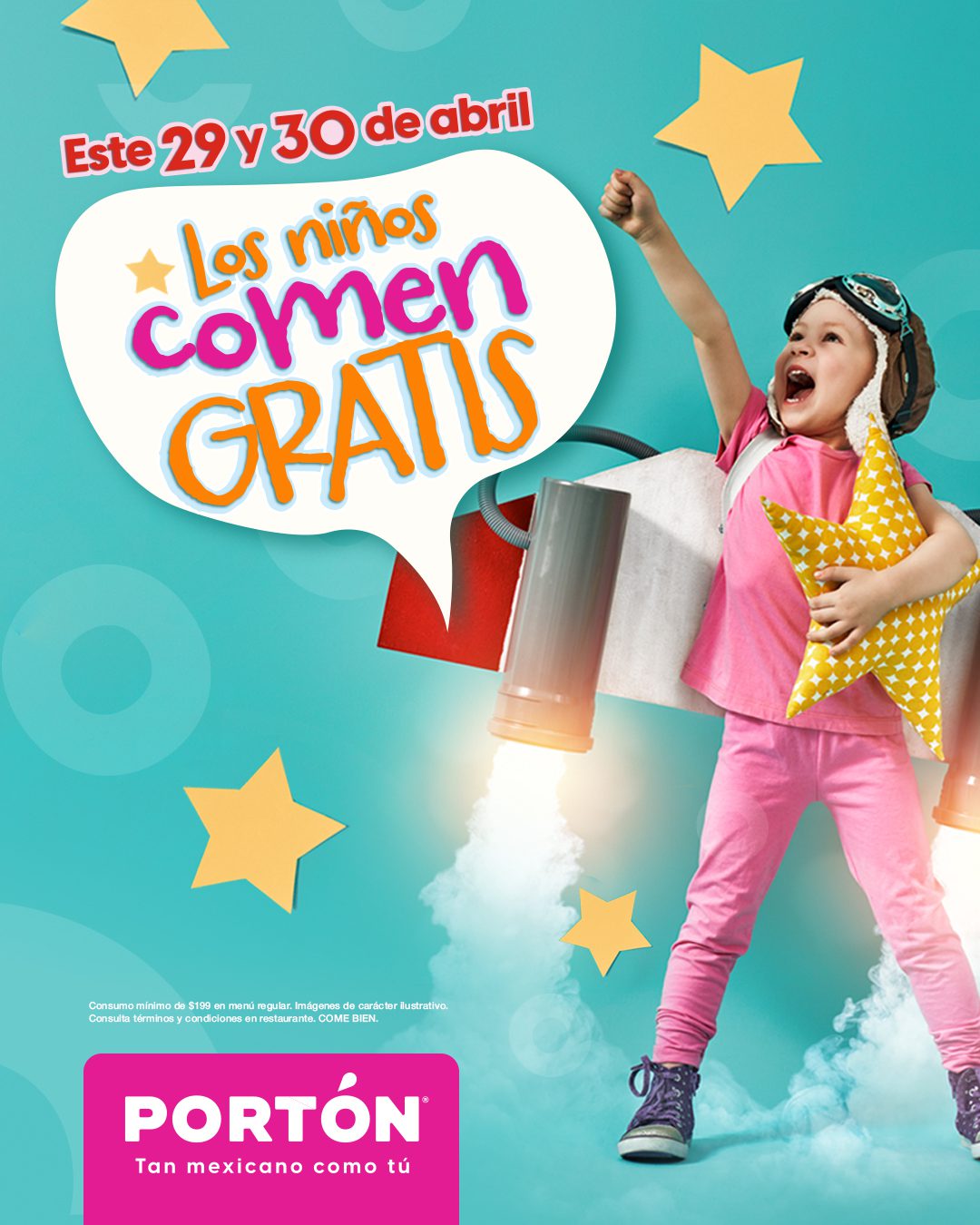 Si estás en busca de opciones para festejar el Día del Niño, te comento que en El Portón con su promoción ¡Pequeños invitados, gran celebración!, los Niños comerán GRATIS; la promoción aplica en consumos por un mínimo de $199.00 en menú regular, estará vigente solo el 29 y 30 de abril de 2026 y es válida en sus sucursales físicas.