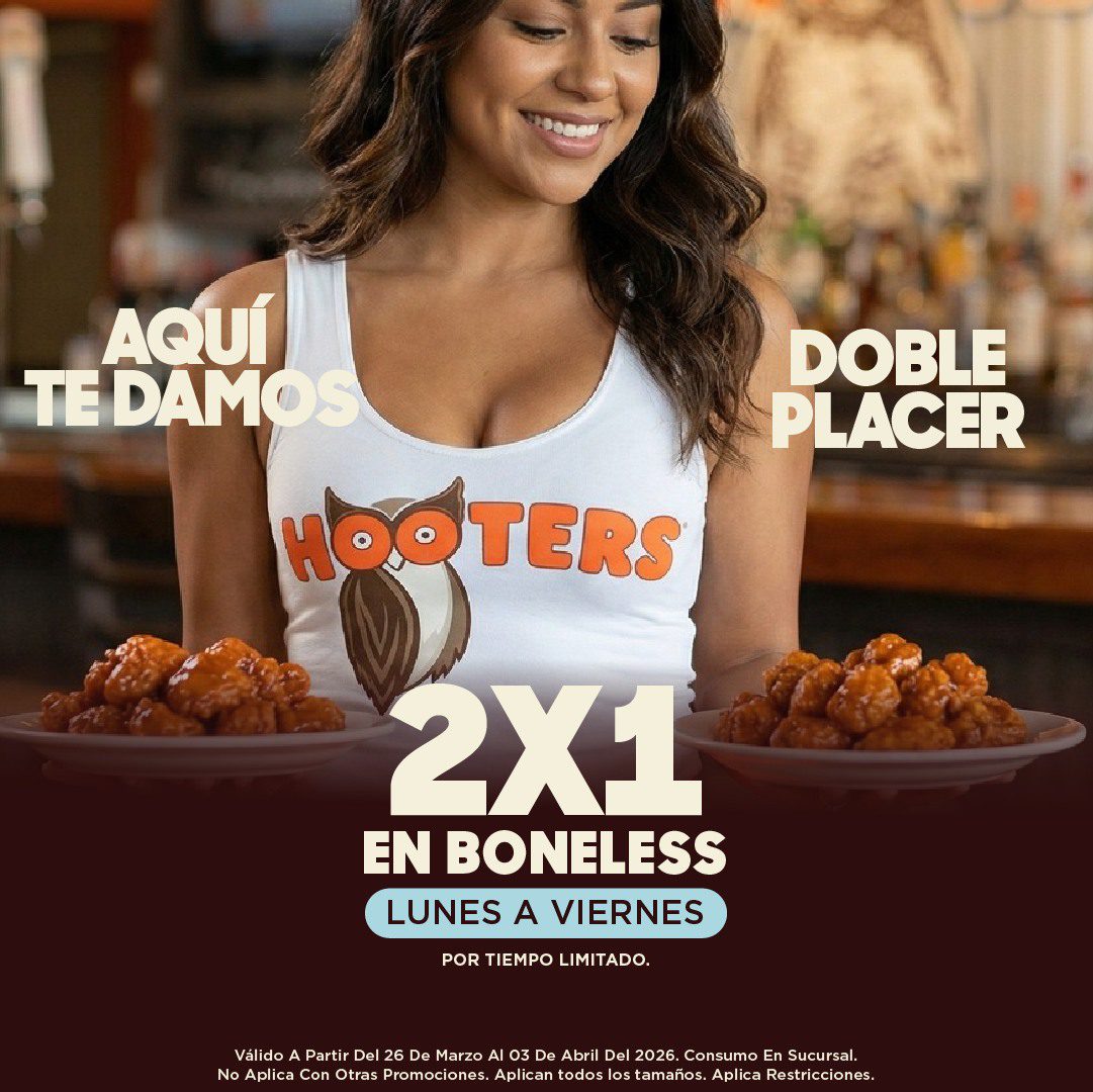 Si estás buscando opciones para comer, te comparto la promoción Aquí te damos Doble Placer de Hooters, en la que te ofrecen un 2×1 en Boneless de todos los tamaños; la promoción estará vigente del 26 de marzo al 03 de abril de 2026, es válida en únicamente para consumo dentro del restaurante, y aplica de lunes a viernes en sus sucursales físicas.