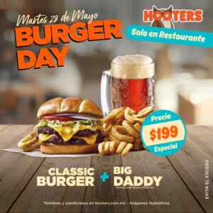Si estás buscando opciones para celebrar el Burger Day, te comento que en Hooters, te ofrecen 1 Classic Burger + 1 Cerveza Big Daddy (de barril 900 ml) a un Precio especial de $199.00; la promoción estará vigente sólo hoy martes 28 de mayo de 2024, aplica para consumo en cerveza de Grupo Modelo: Clara, Oscura y Campechana en sucursales: Atizapán, Guadalajara, Puebla y Querétaro; cerveza de Grupo Heineken: XX Lager, XX Ambar, Heineken e Indio en sucursales: Acoxpa, Antea, Buenavista, Centro Santa Fe, Cosmopol, Del Valle, Delta, La Diana, La Rosa, Las Américas, Oasis Coyoacán, Parque Tepeyac, Plaza Central, Plaza Satélite, Polanco, San Ángel, Universidad y Vía Vallejo.