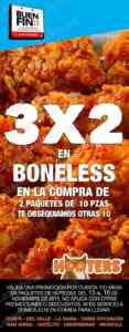 Si van a Hooters durante el Buen Fin se pueden llevar alitas boneless al 3×2. La promoción funciona de la siguiente manera: En la compra de 2 paquetes de 10 piezas les obsequian otras 10 alitas. Válida una promoción por cuenta y por mesa, solamente del 13 al 16 de noviembre en los restaurantes: Coapa, Del Valle, La Diana, Oasis Coyoacán, San Ángel, Satélite, Universidad y Mexicali.