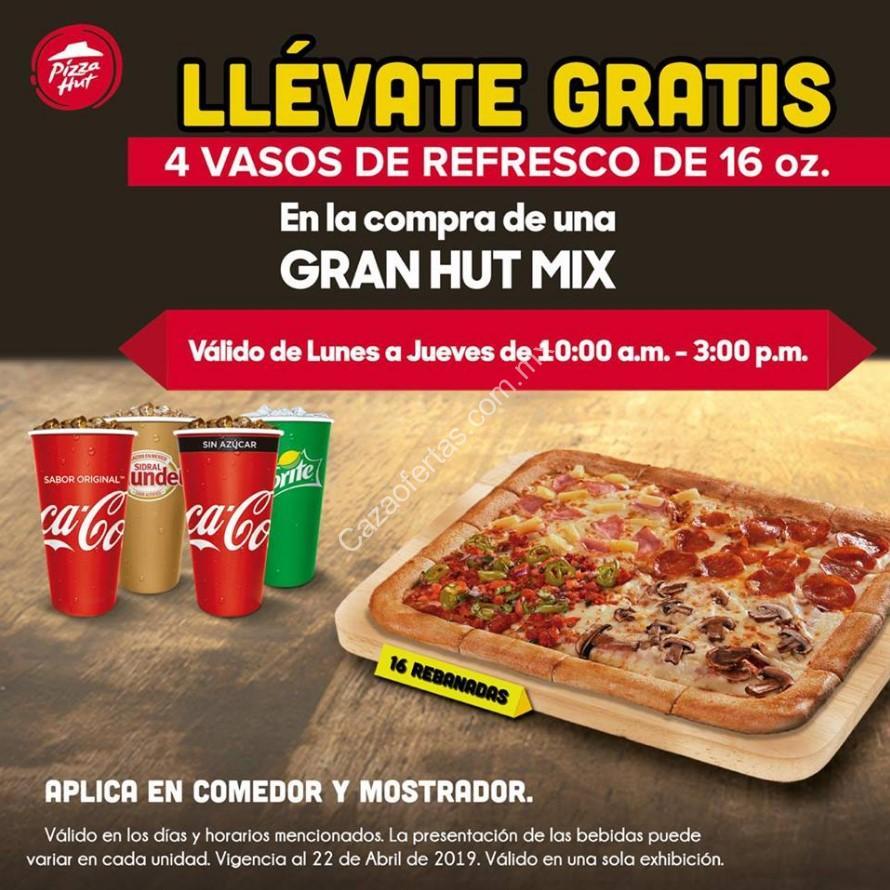 Si todavía no decides que vas a comer, mira esta promoción de Pizza Hut: si compras una Gran Hut Mix (16 piezas) te darán GRATIS 4 vasos de refresco de 16 oz. La promoción es válida de lunes a jueves de 10.00 a 15.00 horas, y está vigente hasta el 22 de abril de 2019.