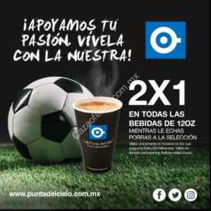 En Punta del Cielo también hay promoción durante el Mundial Rusia 2018. En los horarios en que juega la Selección Mexicana estarán dando 2×1 en bebidas de 12 oz. Esta promoción estará disponible en sucursales participantes. Pregunten por las bebidas que entran en la promo. Aplica sólo para los días en que juega la selección.
