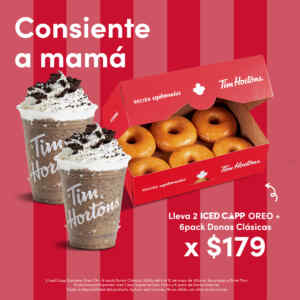 Te comparto la promoción Consiente a Mamá por el Día de las Madres de las cafeterías Tim Hortons, en la que te ofrecen 1 Paquete de 6 Donas clásicas + 2 Iced Capp Supreme Oreo a un Precio especial de $179.00; la promoción es válida en sucursales físicas y Drive Thru y tiene una vigencia del 06 al 12 de mayo de 2024.