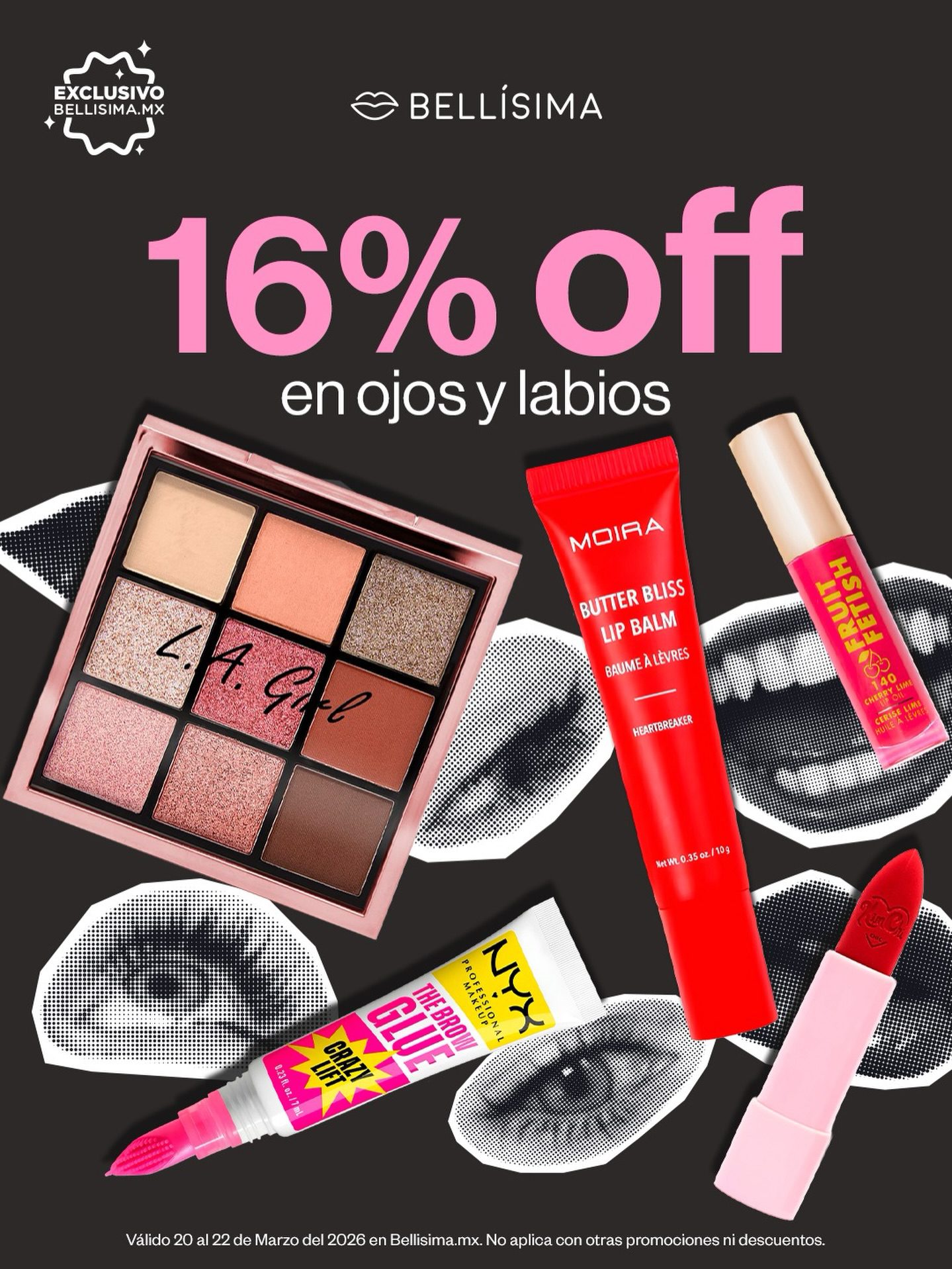 En las tiendas de productos y accesorios de belleza Bellísima, está su promoción No es Presión, en la que están dando un 16% de descuento en productos de Ojos y Labios; la promoción aplica artículos seleccionados, es válida en su sitio de Internet www.bellisima.mx y estará vigente del viernes 20 al domingo 22 de marzo de 2026.