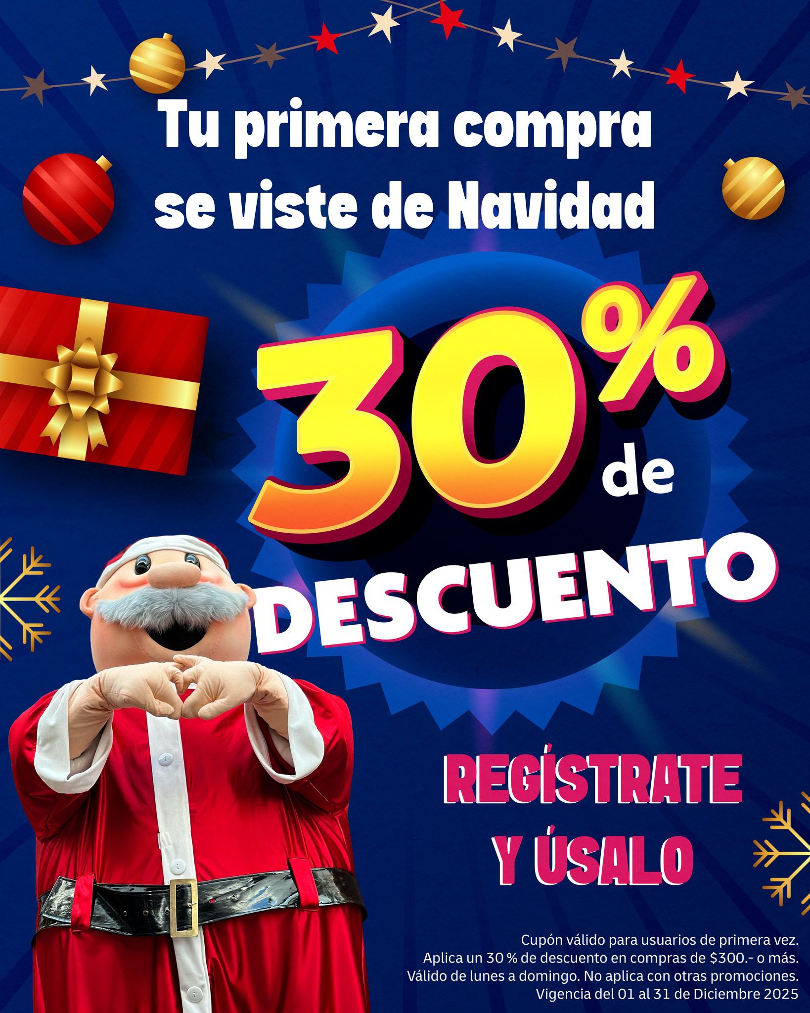 Te comparto la promoción Tu Primera Compra se viste de Navidad, de las Farmacias Similares; en la que te darán un 30% de descuento en tu Primera Compra en su tienda en línea; la promoción aplica de lunes a domingo en compras a partir de $300.00, cuenta con una vigencia del 01 al 31 de diciembre de 2025 y necesitas Registrarte en su sitio web www.farmaciasdesimilares.com.