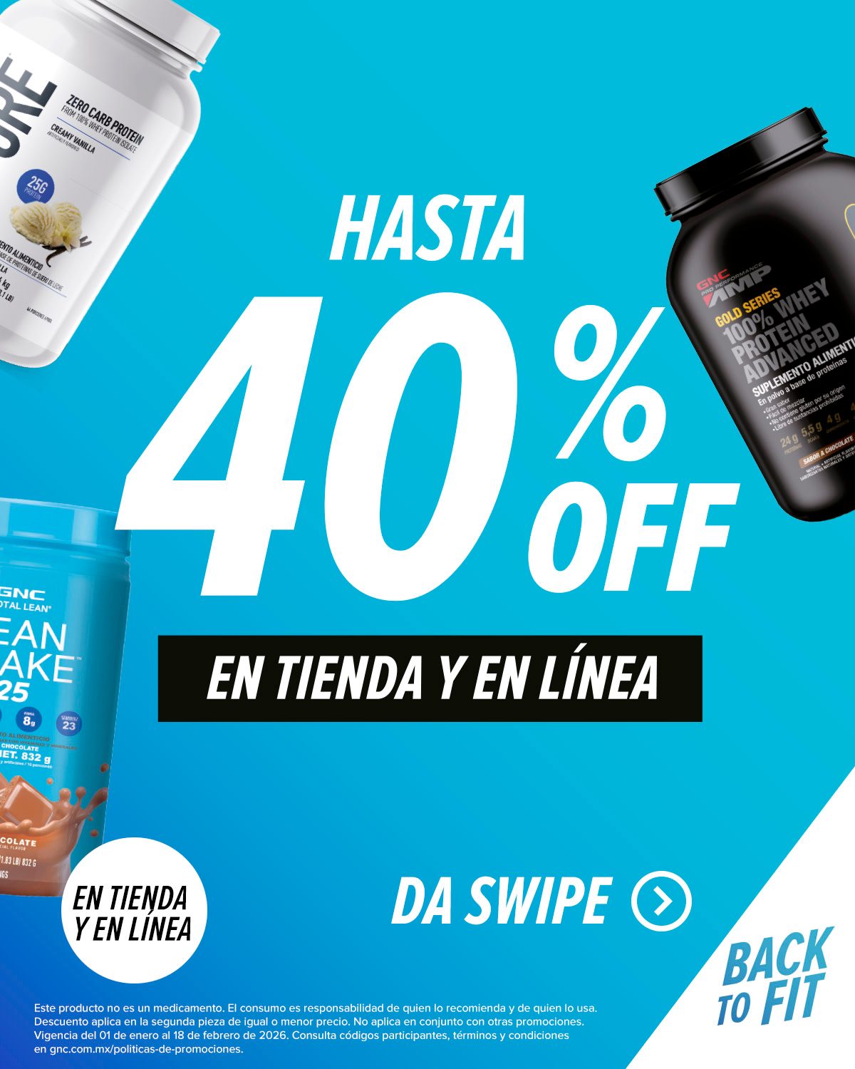 Las tiendas de productos de salud y nutrición GNC anunciaron su promoción Convierte tus propósitos en realidad, en la que te están ofreciendo hasta un 40% de descuento; la promoción aplica en artículos seleccionados, es válida en su tienda en línea https://gnc.com.mx/ y en sus sucursales físicas y estará vigente del 01 de enero al lunes 18 de febrero de 2026 o hasta agotar existencias.