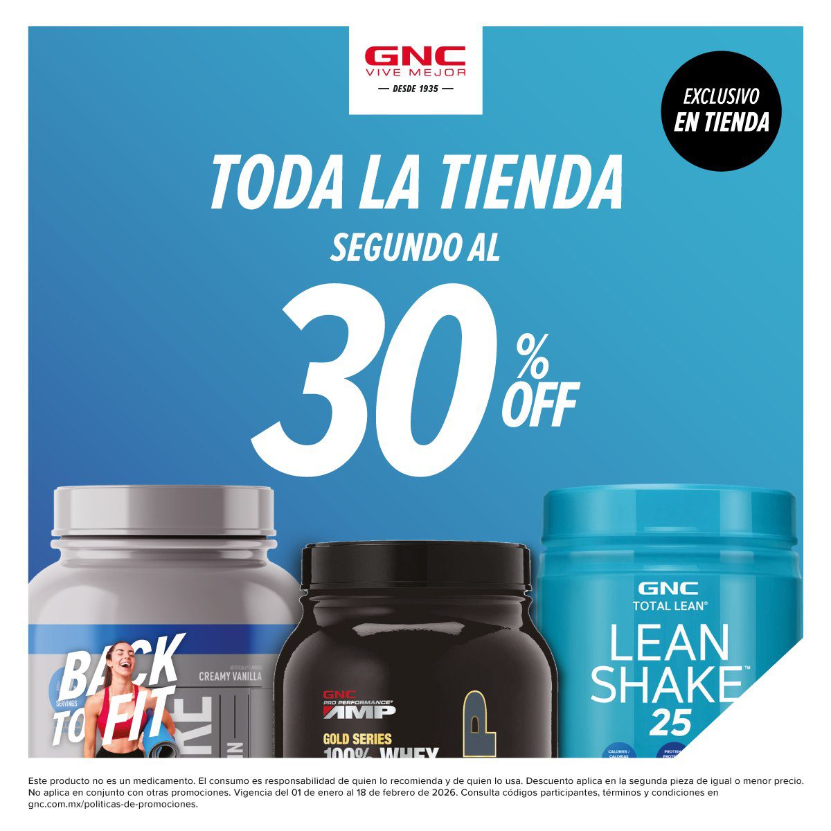 Hace un momento vi que las tiendas de productos de salud y nutrición GNC publicaron su promoción Back to Fit, en la que te están ofreciendo un 50% de descuento en la Segunda pieza de toda la tienda (el descuento aplica en el producto de igual o menor precio); la promoción es válida en sus sucursales físicas y estará vigente del 01 de enero al 18 de febrero de 2026 o hasta agotar existencias.