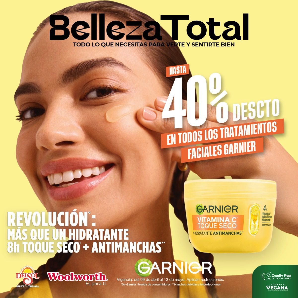 Hace unos minutos me di cuenta que en las tiendas departamentales Del Sol y Woolworth con su promoción Belleza Total, te están ofreciendo hasta un 40% de descuento en todos los Tratamientos Faciales Garnier; la promoción aplica en mercancía seleccionada, es válida en sus sucursales físicas, en su tienda en línea delsol.com.mx y estará vigente del 13 de abril al 12 de mayo de 2026.