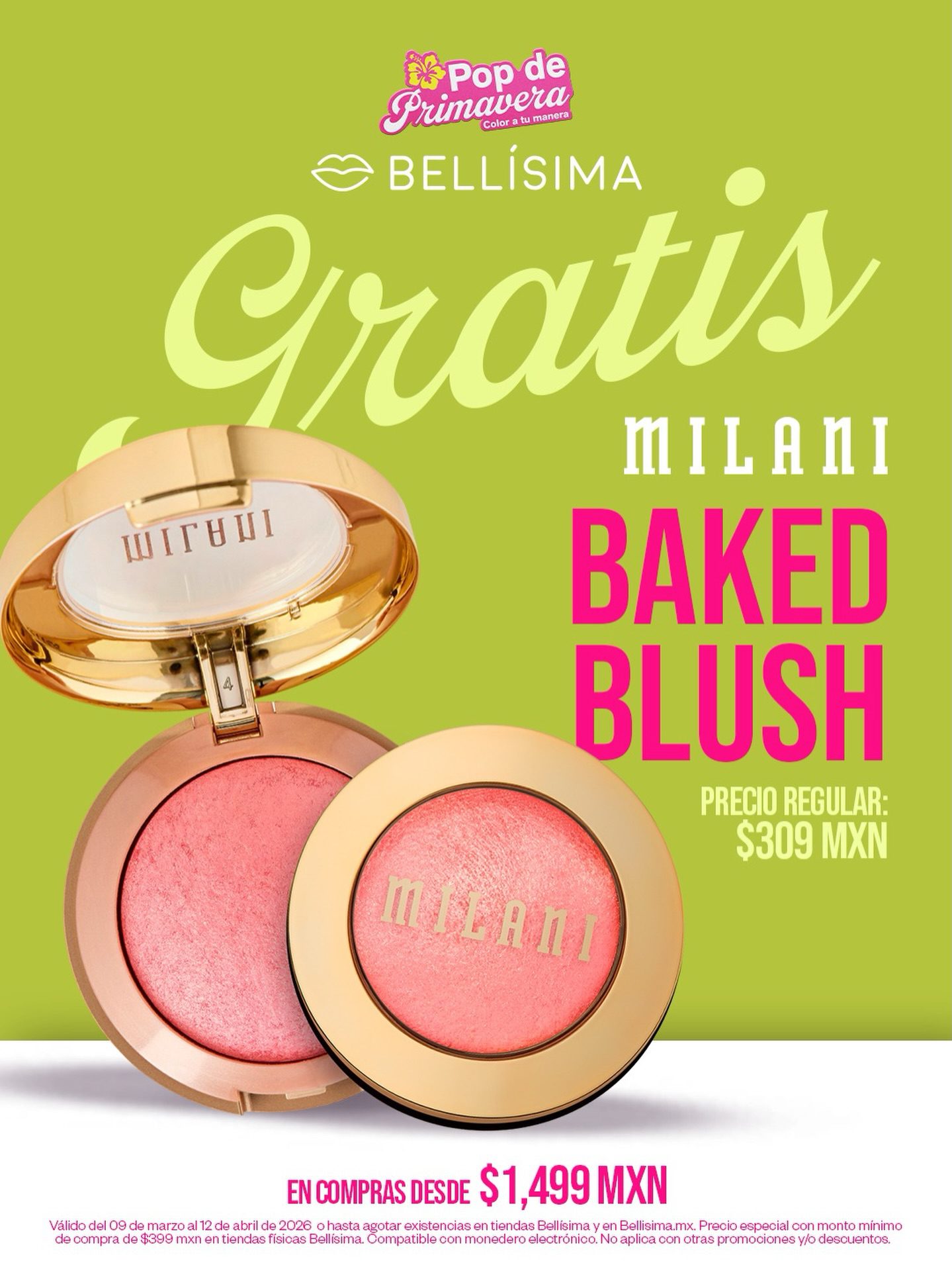 Te comparto la promoción Pop de Primavera de las tiendas de productos y accesorios de belleza Bellísima, en la que si realizas una compra superior a $1,499.00, te darán Gratis el Baked Blush de Milani (su precio regular es de $309.00), ó te darán un Precio especial en montos desde $399.00 en sus tiendas físicas; la promoción es válida en sucursales físicas y en su página de Internet bellisima.mx y estará vigente del 09 de marzo al 12 de abril de 2026 o hasta agotar existencias.