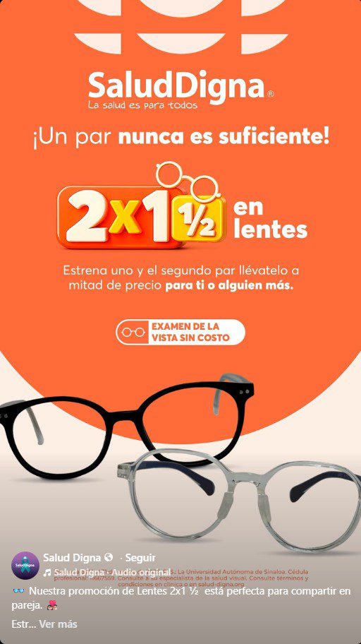 Les comento que en Salud Digna con su promoción ¡Un Par Nunca es Suficiente!, te ofrecen que en la compra de un Par de Lentes, te llevarás el Segundo Par con un 50% de descuento, ya sea para ti o parara alguien más; la oferta es válida directamente en tu clínica más cercana (que puedes ubicar en este enlace: https://bit.ly/UbicaTuClínicaSD ) y estará vigente del 01 al 31 de marzo de 2026.