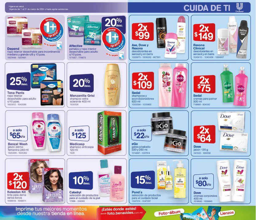 Te comparto el folleto “Sentirte Acompañado, es Sentirte Mejor” de las Farmacias Benavides, que contiene sus ofertas que estarán vigentes del 01 al 31 de marzo de 2024, y en el que encontrarás 3×2, 4×3, Ahorros especiales en la compra de determinadas unidades, hasta un 50% de descuento en la segunda pieza, hasta un 40% de descuento sobre precio máximo al público, hasta un 45% de descuento, Productos Gratis al acumular determinadas unidades, Ofertas en productos de marcas propias, Precios especiales y Envío Gratis; las ofertas son válidas en productos participantes.