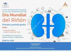 El centro de diagnóstico de los Hospitales Ángeles en la «Conmemoración del Día del Riñón» te darán la primera consulta GRATIS que incluye la valoración médica y un examen general de orina, con una vigencia hasta el 31 de mayo de 2019. Debes hacer cita; el número telefónico de la unidad Polanco es 1101 5400 ext. 8241.