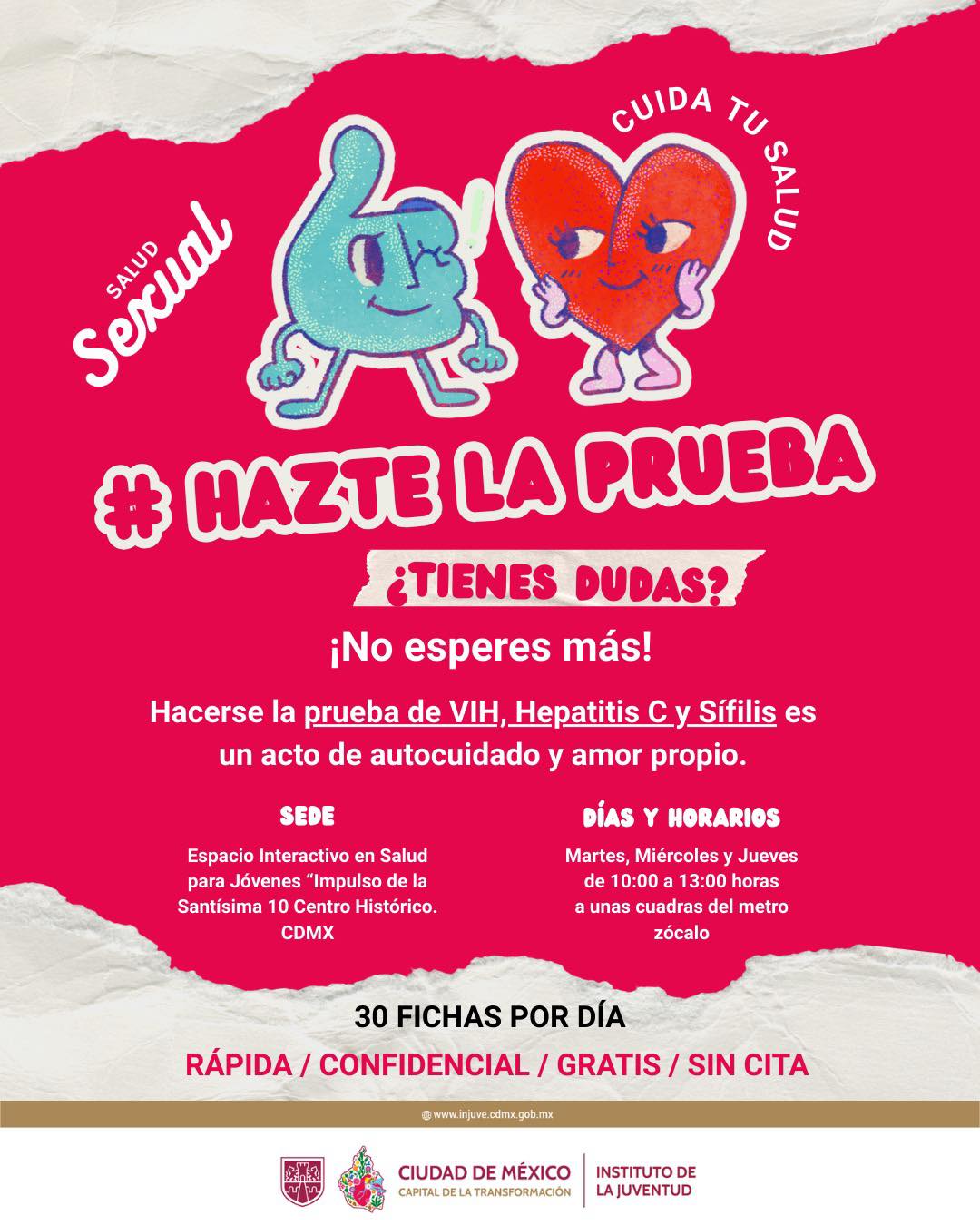 Hace unos minutos me di cuenta que el Instituto de la Juventud (Injuve) de la CDMX, está ofreciendo Pruebas GRATUITAS de VIH, Hepatitis C y Sífilis; el programa está dirigido a Jóvenes de entre 12 y 29 años de edad, aplica los días Martes, Miércoles y Jueves de las 10:00 a las 13:00 horas y solo deberás acudir a su Espacio Interactivo en Salud para Jóvenes “Impulso de la Santísima”, en Santísima 10, Centro Histórico, CDMX (a una cuadra del Metro Zócalo).