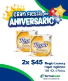 Sigue la Gran Fiesta de Aniversario de Farmatodo y en esta ocasión te ofrecen el Papel higiénico Regio Luxury de 198 hojas dobles 4 Rollos a 2 $ 45; la ...