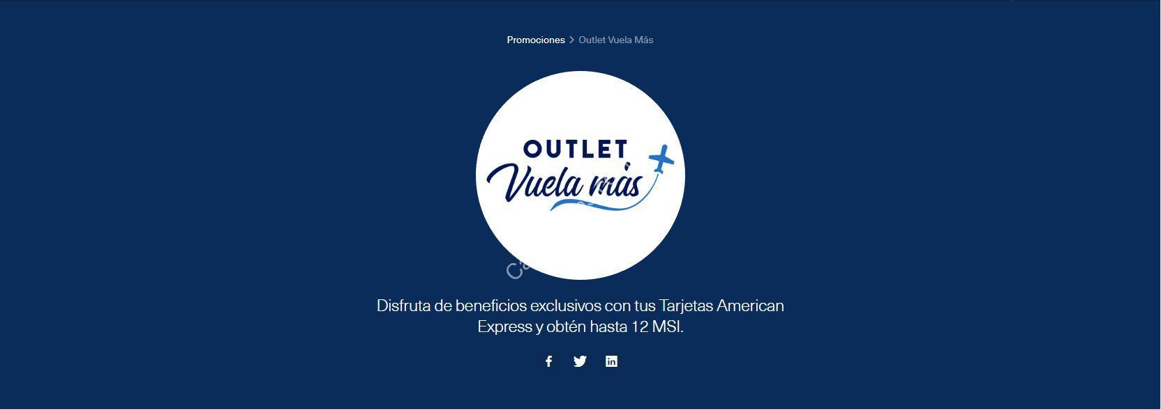 El Outlet de Aeroméxico con su promoción Vuela Más, está ofreciendo hasta un 20% de descuento en vuelos Nacionales e Internacionales y hasta 12 meses sin intereses si pagas con tarjetas American Express; deberás realizar tu compra del 02 al 15 de septiembre de 2019 en su página web Aeromexico.com, en su Call center o en sus Tiendas de viajes y usar el código 3B0332F2, para viajar del 02 de septiembre de 2019 al 31 de marzo de 2020. El descuento es aplicable solo en la tarifa antes de impuestos y cargos en las clases de las familias: Clásica, Flexible, AM Plus y Premier