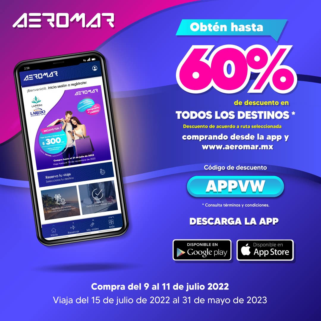 Te comento que Aeromar publicó una promoción, en la que están dando hasta un 60% de descuento en todos los destinos en tarifa base y Q; debes realizar tu compra hoy lunes 15 de julio de 2022, aplica en su sitio web www.aeromar.mx y en su Nueva App (que puedes descargar desde esa misma página), deberás usar el código de descuento APPVW y es para viajar del 15 de julio de 2022 al 31 de mayo de 2023.
