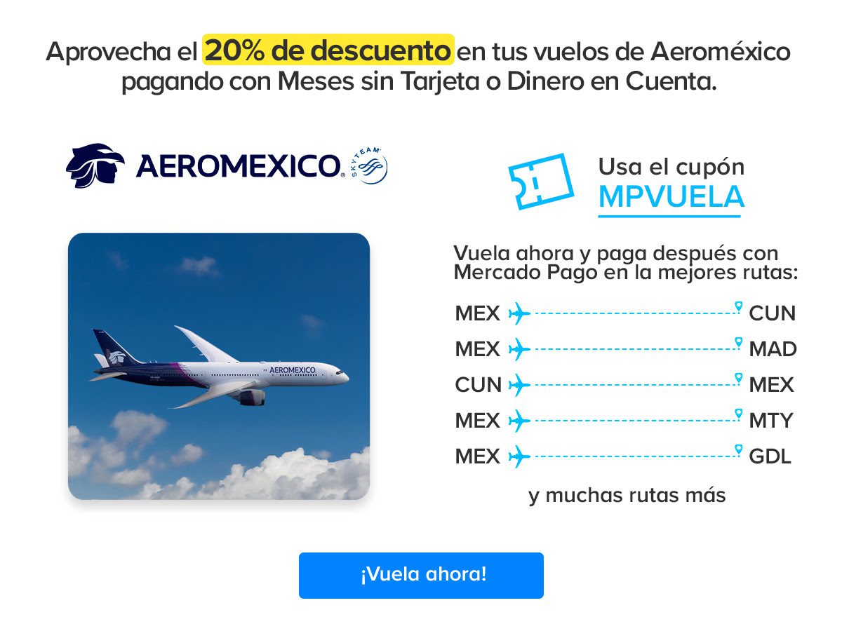 Hasta el viernes 17 de octubre de 2025, en Aeroméxico estará una promoción, en la que te ofrecen un Cupón del 20% de descuento en Vuelos; la promoción aplica para Usuarios logueados en Mercado Pago con Meses sin Tarjeta ó Dinero en Cuenta, es válida en su página de Internet www.aeromexico.com/es-mx en la que deberás utilizar el cupón MPVUELA.