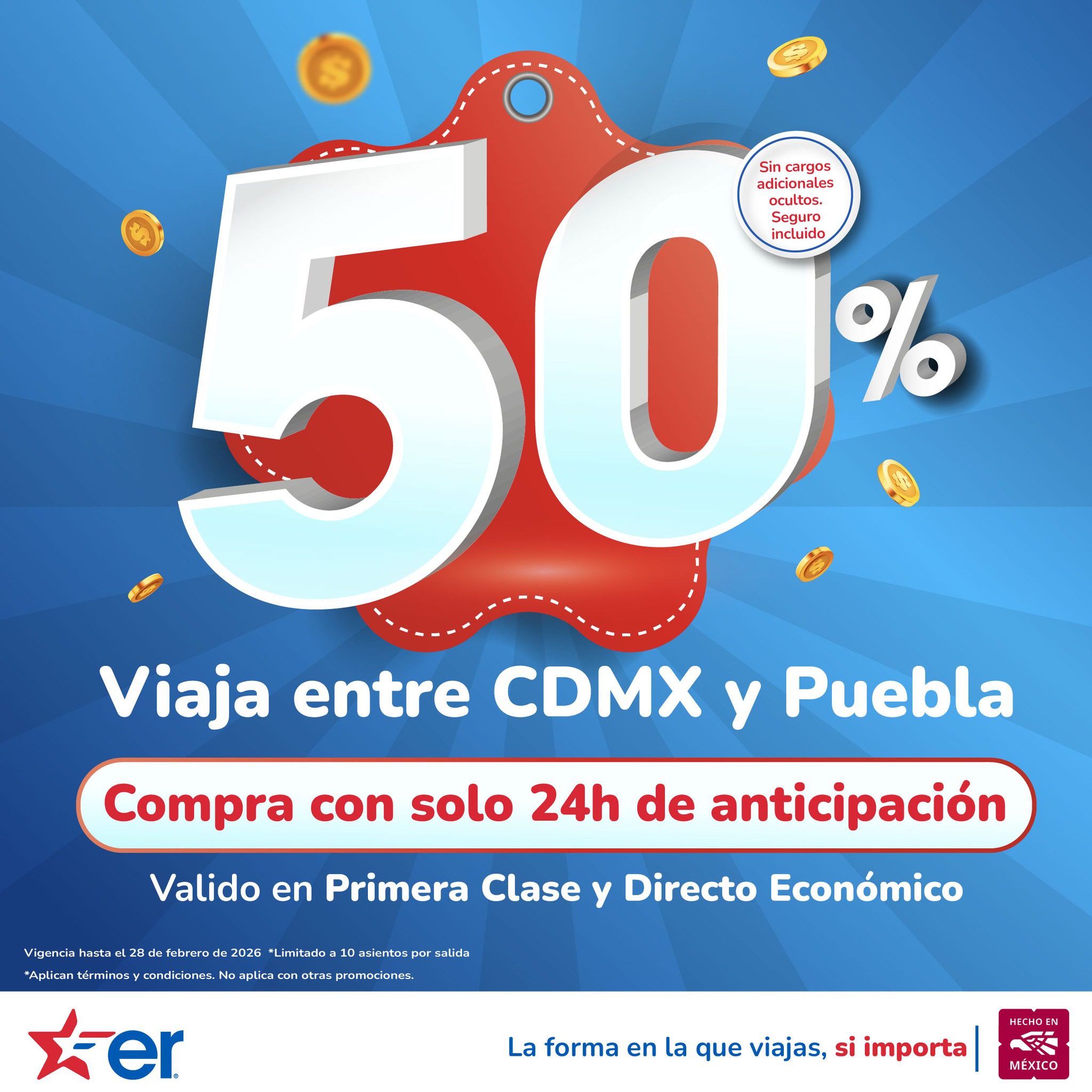 La línea de autobuses Estrella Roja, anunciaron una promoción, en la que están ofreciendo un 50% de descuento en Viajes entre la CDMX y Puebla; la promoción aplica en compras con un mínimo de 24 horas de anticipación, participan sus Servicios Primera Clase y Directo, es válida en su sitio web www.estrellaroja.com.mx/, en su App (que puedes descargar desde estos enlaces: Apple o Android) y en sus Taquillas y estará vigente hasta el 28 de febrero de 2026.