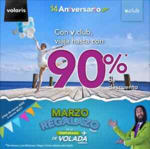 Continúan las ofertas por el 14 Aniversario de Volaris y en esta ocasión, exclusivamente para miembros de V.club, está ofreciendo hasta un 90% de descuento en vuelos Nacionales e Internacionales en reservación básica y clásica; el descuento aplica únicamente a la tarifa aérea y no aplica en TUA, impuestos y servicios adicionales. Deberás realizar tu compra del 04 al 06 de marzo de 2020 en su página de Internet https://bit.ly/2PszMa8 en la que deberás usar el código VUELAVC y es para viajar del 04 de marzo de 2020 al 13 de marzo de 2021.