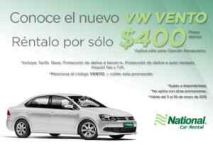 Les comparto esta promoción por si tienen planeado ir de vacaciones a Cancún durante enero, ya que la promoción es válida hasta el 30 de enero. En National Car Rental pueden rentar un Vento de Volkswagen (categoría auto grande) por sólo $400 por día con seguro, airport fee e impuestos incluidos. El costo regular de la renta de un auto de este tipo es de más del doble. La promoción aplica sólo para la sucursal aeropuerto de Cancún, para que les den esa tarifa tienen que reservar en la página https://nationalcar.com.mx seleccionar la sucursal aeropuerto Cancún y utilizar el código VENTO