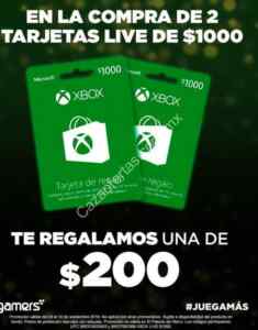 Me acabo de enterar que este fin de semana en la compra de 2 tarjetas XBOX Live de $1,000 pesos te darán una Tarjeta Live de regalo de $200 pesos. Esta promoción estará vigente del 24 al 30 de septiembre del 2018. Aplica para todas las sucursales Gamers, excepto dentro de Palacio de Hierro.